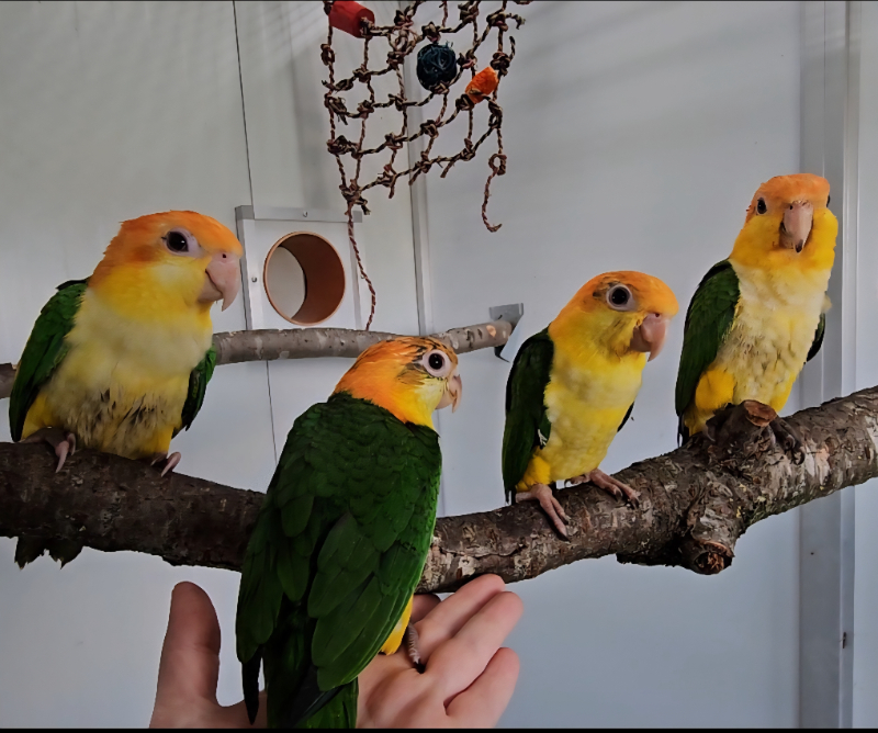 4.1 gelbschenkelige Rostkappenpapageien, 1.1 ist blutsfremd. Alle sind fehlerfrei, geschlossen Edelstahl beringt mit DNA und Herkunftsnachweise.