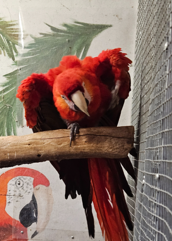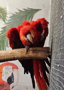 0,1 Hellroter Ara von 2020, Naturbrut,aber zutraulich, geschlossen beringt, hatte schon Eier, leicht gerupft, nur Abholung