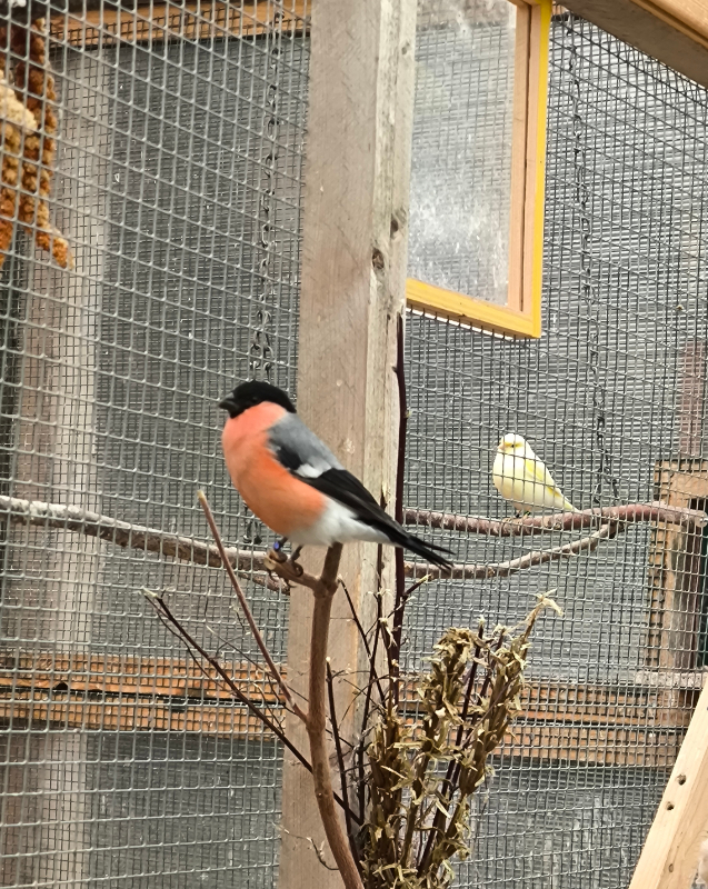 Der Dompfaff lebt in einer geschützten Außenvoliere, er ist Meldepflichtig.