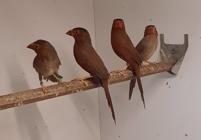 1.1 Gelbbauch Sonnenastrilde, 1.1 Schwarzbauch Sonnenastrilde, 2.2 Fünffarbennonnen, 2.2 Schwarzbrustnonnen, 2.0 Dreifarbennonnen, 2.0 Dickschnabelnonnen, 2.0 Blaßkopfnonnen, 2.0 Zwergschilffinken, 10 Maskenamadienen, 1.1 Spitzschwazamadinen 0.1 Weiß, 2.2 Gelbe Binsen, 3.0 Lauchgrüne PA, 6 Bunte RKPA. Kein Vesand. |