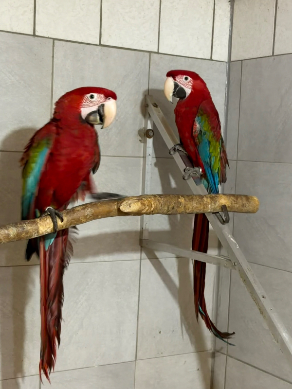 1,1 Dunkelrote Aras aus 2025/2024. Er Naturbrut sie ehemalige Handaufzucht. Ihr wurden von einem Hellroten Ara die Schwungfedern abgebissen, deshalb kann die zur Zeit nicht fliegen. Gebe sie zusammen günstig ab. Sind sehr große Tiere, fast 100 cm.