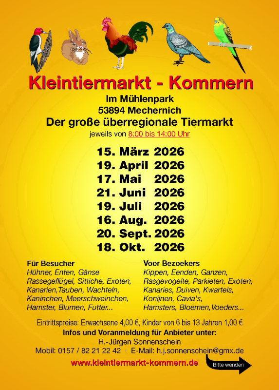 Liebe Tierfreunde, am 15.03.2026 findet in 53894 Mechernich, Im Mühlenpark wieder eine Vogelbörse statt. Zusammen mit einem Kleintiermarkt. Angeboten werden Sittiche, Exoten Kanarien, Hühner, Geflügel, Futter und Zubehör. Von 8.00-14.00 Uhr. Wir freuen uns auf Eueren Besuch. Weitere Infos gerne per Telefon.