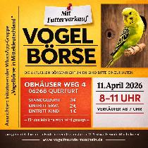 Vogelbörse am 11.4.26 in 06268 Querfurt Obhäuser Weg 4 in der Zeit von 8-11Uhr für Verkäufer ist ab 7Uhr geöffnet . Es werden nur saubere und nicht überbesetzte Käfige zu gelassen , die aktuellen Börsenrichtlienen sind zwingend einzuhalten. Für Speisen und Getränke ist gesorgt und Futtermittel stehen auch zum verkauf bereit.Wir freuen uns auf reges Interesse. Ausgerichtet durch die Vereine Vogelfreunde Mücheln e.V. und Exotenvetein Gatterstädt e.V. |