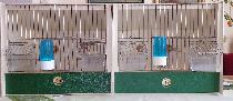 Je eine Falltür und zwei Futterstellen, mit vier Näpfen, Röhrchen, Sitzstangen für Wellensittiche. Kunststoff beige und dunkelgrün